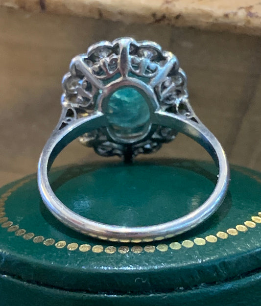 Art Deco 2.1ct Emerald and Diamond Platinum Cluster Ring - Size - M