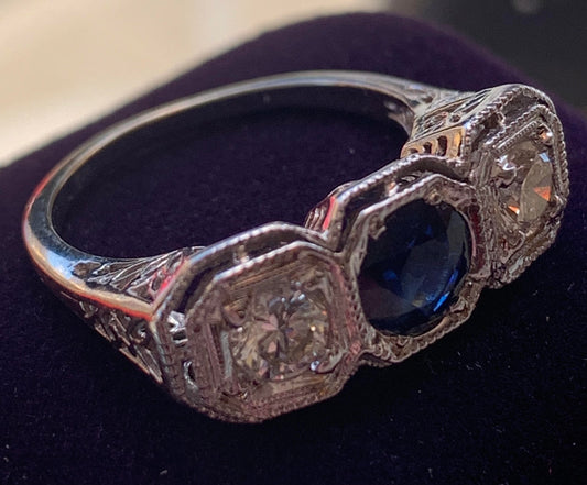 Striking Art Deco Sapphire and Diamond 3 stone ring c.1920 in 15ct Gold - Size N