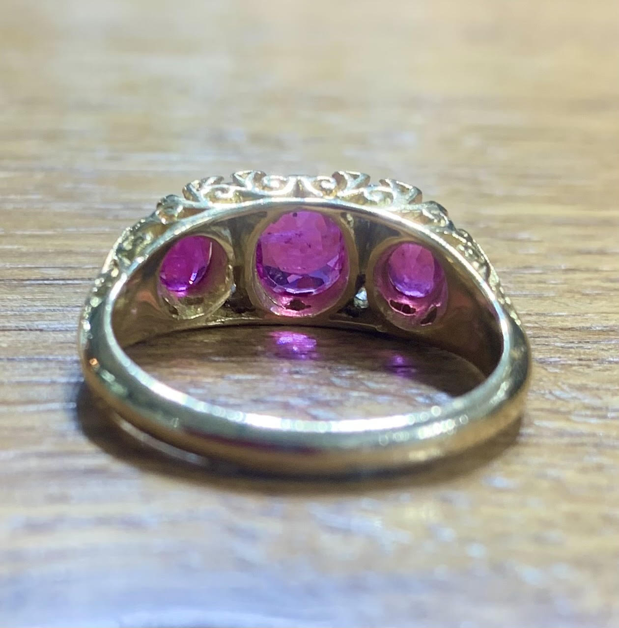 An exceptional antique ruby and diamond trilogy ring set in 18ct gold.
