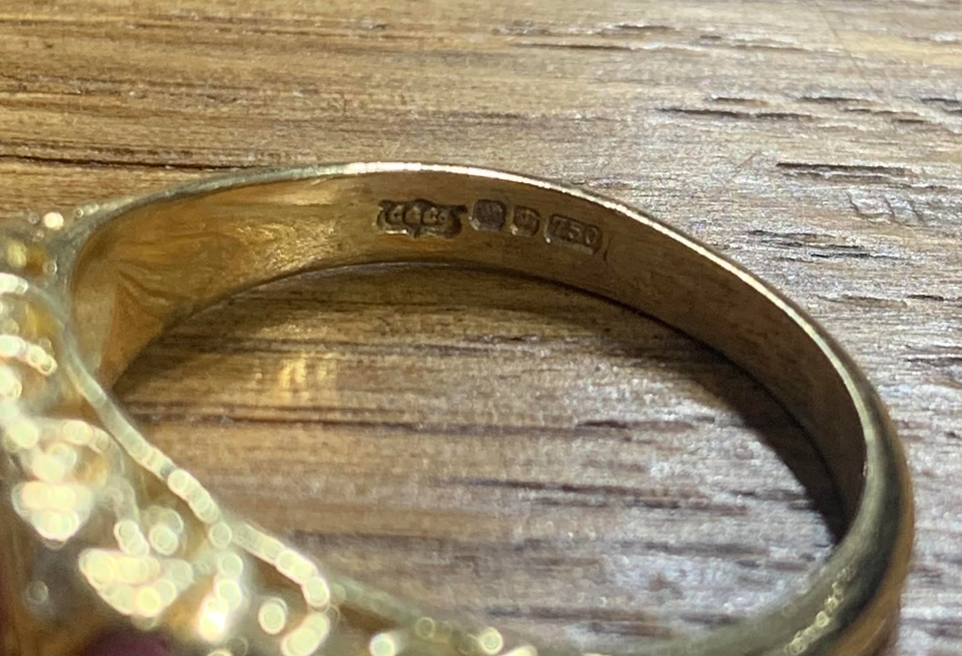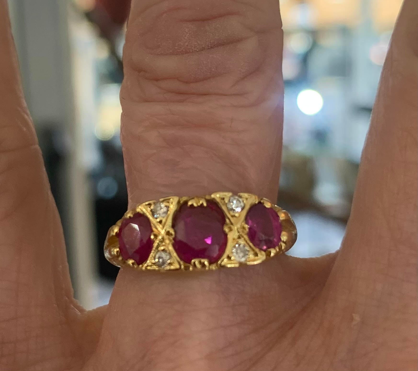 The ring is very versatile and could be worn as an engagement ring or as a dress ring. The 18ct gold gives the ring a warm lustre setting the rubies and diamonds off beautifully and the filigree work which the head of the ring is set in, adds to its antique heritage.