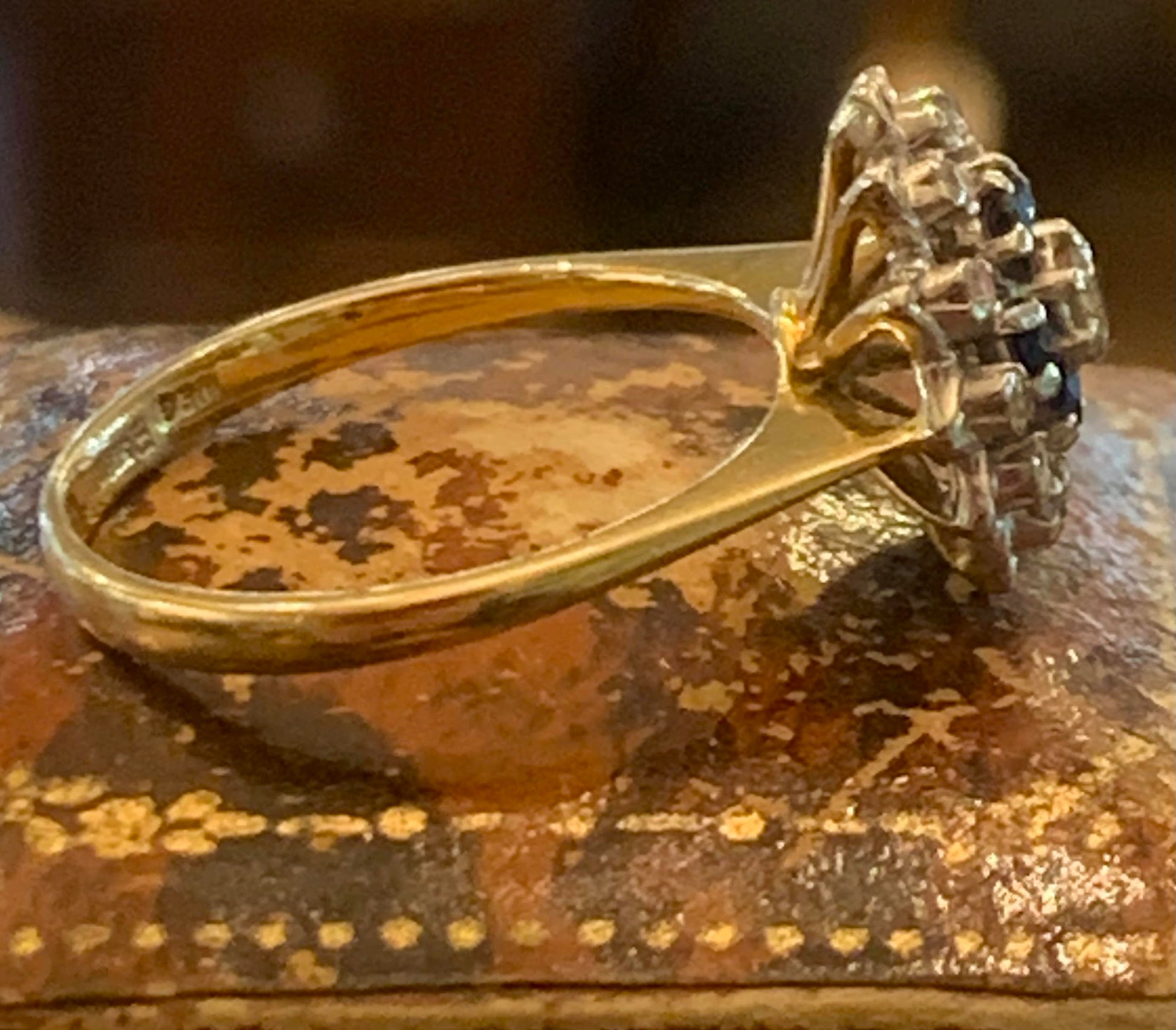 The ring is set with 12 very sparkly diamonds of approx 0.02 carats each encircling 6 sapphires of approx 0.04 carats each and a central diamond of approx 0.05 carats. Total diamond weight is 0.29 carats and total sapphire weight is 0.24 carats. The design of the ring gives a very attractive target affect with the band set in 18ct gold and the head of the ring platinum. It is a beautiful piece and would make an equally striking engagement ring or a dress ring.