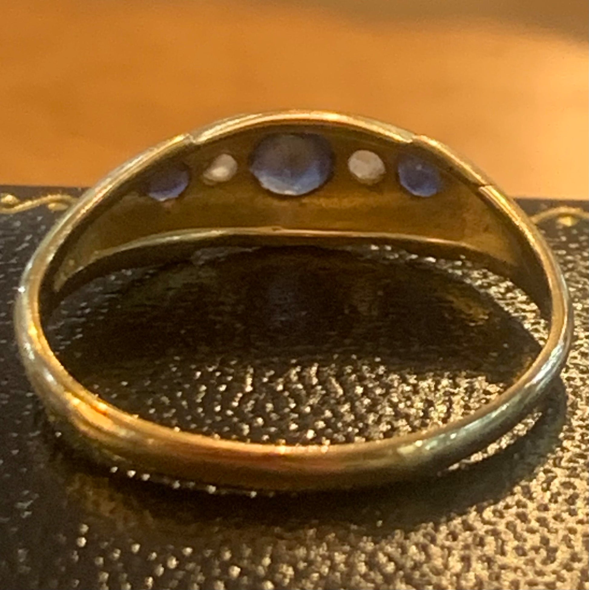 The ring has a very attractive tapering head set with a 0.1ct sapphire to the centre, flanked by a 0.04ct diamond to each side and a further 0.05ct sapphire to each side of the diamonds. Total diamond weight is 0.08cts and total sapphire weight is 0.2cts. Total head size is 15 mm across and 7mm deep.