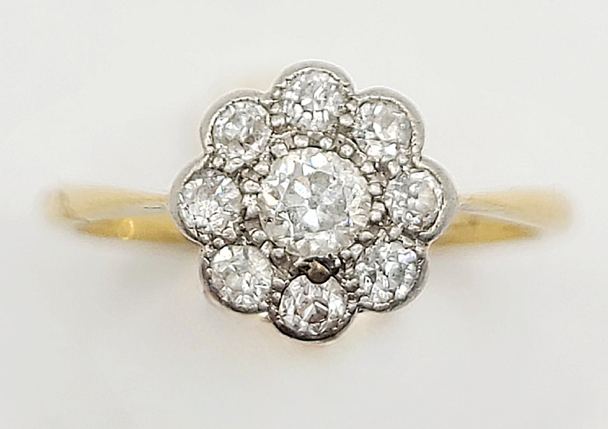 Victorian platinum set 18ct gold diamond cluster ring - size L1/2.