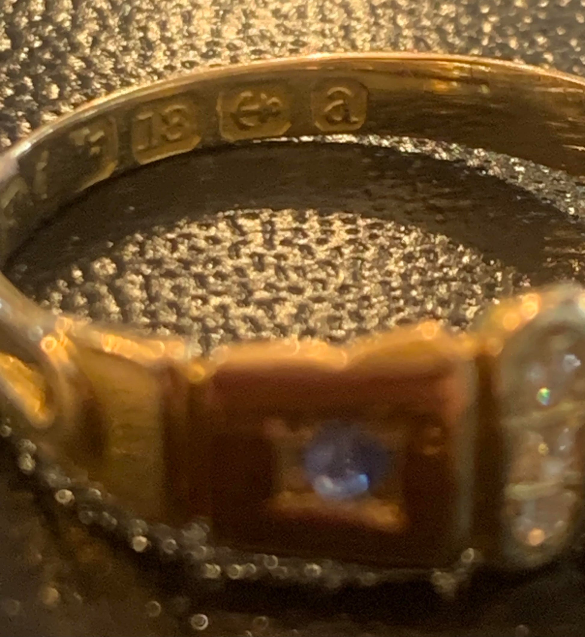 The ring has somewhat of a geometric design with 3 sections across the head. The central vertical panel of 5mm across and 8mm in depth is set with 3 diamonds of approx 0.02 cts each. The two rectangular sections either side of the central panel contain a sapphire of approx 0.05 cts. The total head size is 15mm across and 8mm in depth. This is all set within 18ct gold which gives the ring a very lustrous antique look in keeping with its age and heritage.